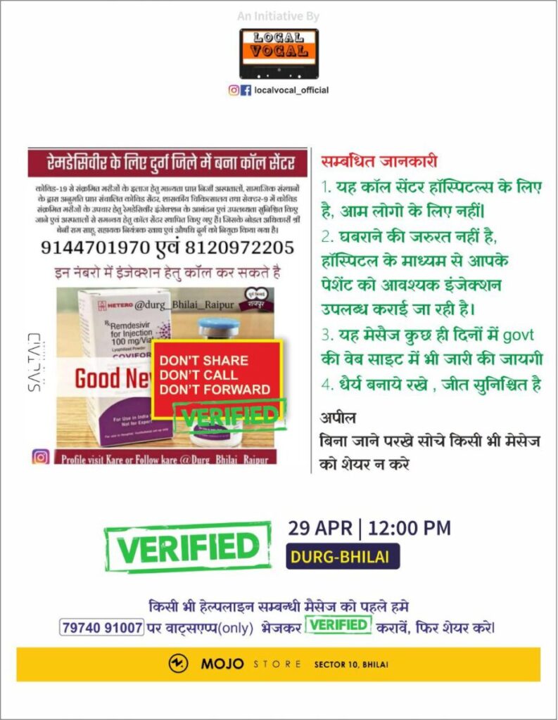 वैरिफ़िएड स्टैम्प के टीम से बात चित में पता चला की असल में हॉस्पिटल्स में व्यवस्था दुरुस्त करने बनाया गया Remdesivir – दुर्ग हेल्पलाइन सेंटर, और इस हेल्प लाइन न. को लिक कर वायरल किया गया है , किन्तु यह आम लोगो के कॉल या मैसेजेस के लिए नहीं है।