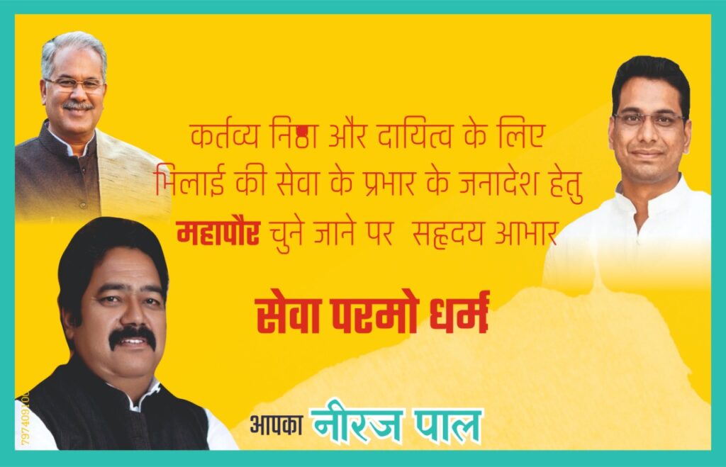 नीरज पाल लोकल वोकल के माध्यम से जनता और कांग्रेस पार्टी के वरिष्ठ पदाधिकारी , कार्यकर्ताओ संग समूचे भिलाई के प्रति आभार जताया। और सेवा परमो धर्मः के मार्ग में अग्रसर रहने की मंशा जाहिर की।
