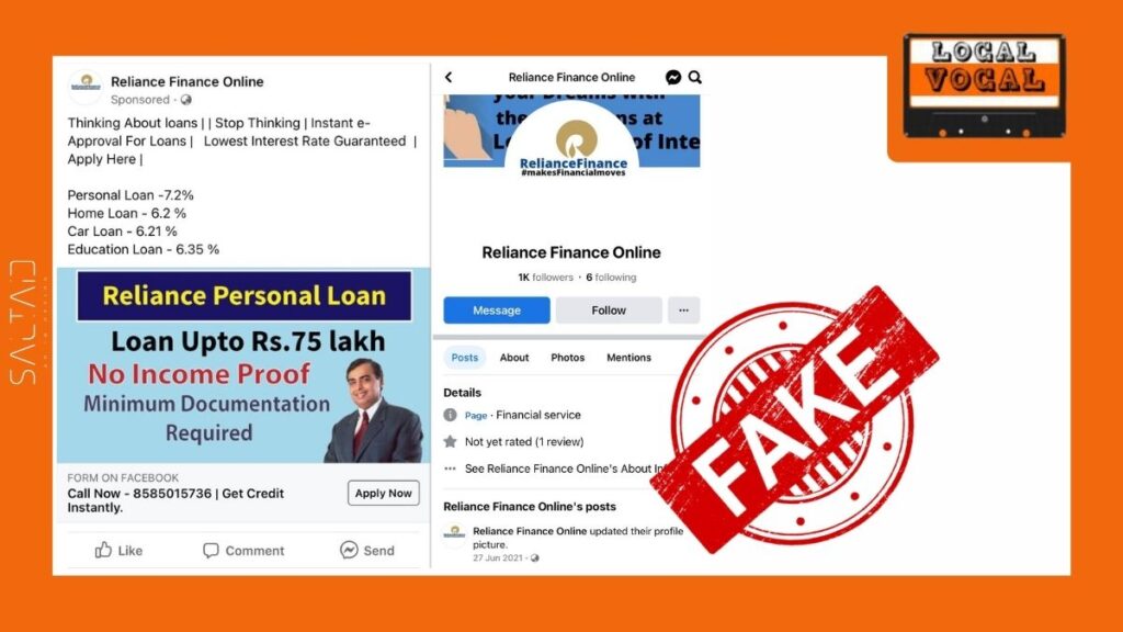 जब आप किसी financial emergency स्थिति में हों और आपको जल्दी से धन की आवश्यकता हो, तो personal loan तत्काल धन के समाधान की तरह लग सकता है। और ऐसे में instant e-approval for loans, lowest interest rate guaranteed loan, no income proof – minimum documentation required जैसी schemes में लोग आसानी से फंस जाते है। दी हुई तस्वीर में ऐसे ही एक Reliance Personal Loan Scheme हमारे सोशल मीडिया पर सामने आयी। जिसमे instant loan approval, minimum document required तथा lowest interest rate की गारंटी जैसी सुविधाएं उपलब्ध करने की बात कर रहे। तो अगर आपने भी ये ad फेसबुक पे या अन्य सोशल मीडिया platform या इंटरनेट पर कही पे देखी है तो ये article LOCAL VOCAL की तरफ से आपको सावधान करने के लिए है की ये एक फ्रॉड है। यह ad पूरी तरह से फ्रॉड है, LOCAL VOCAL का FAKE stamp इसकी 100 प्रतिशत पुष्टि करता है। कृपया इसमें न फंसे। और अगर फिर कभी ऐसा कोई loan वगैरह से जुड़ा ad आपकी नज़र में आता है, तो आप निम्न बातों का ध्यान रख स्वयं उसके fake होने न होने की पुष्टि कर सकते है :